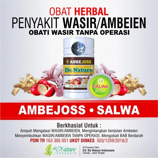 Obat Wasir Ambeien Ampuh di Apotik adalah dari luar dan dalam sehingga ambeien benar-benar tuntas dan tidak akan kambuh lagi. Ambejoss dan Salep Salwa dari De Nature adalah obat ambeien herbal yang memang terbaik untuk mengobati ambeien dan sudah terdaftar di badan obat dan makanan (BPOM). Terbuat dari bahan alami antara lain terdiri Daung Ungu, Mahkota Dewa dan Kunyit Putih.